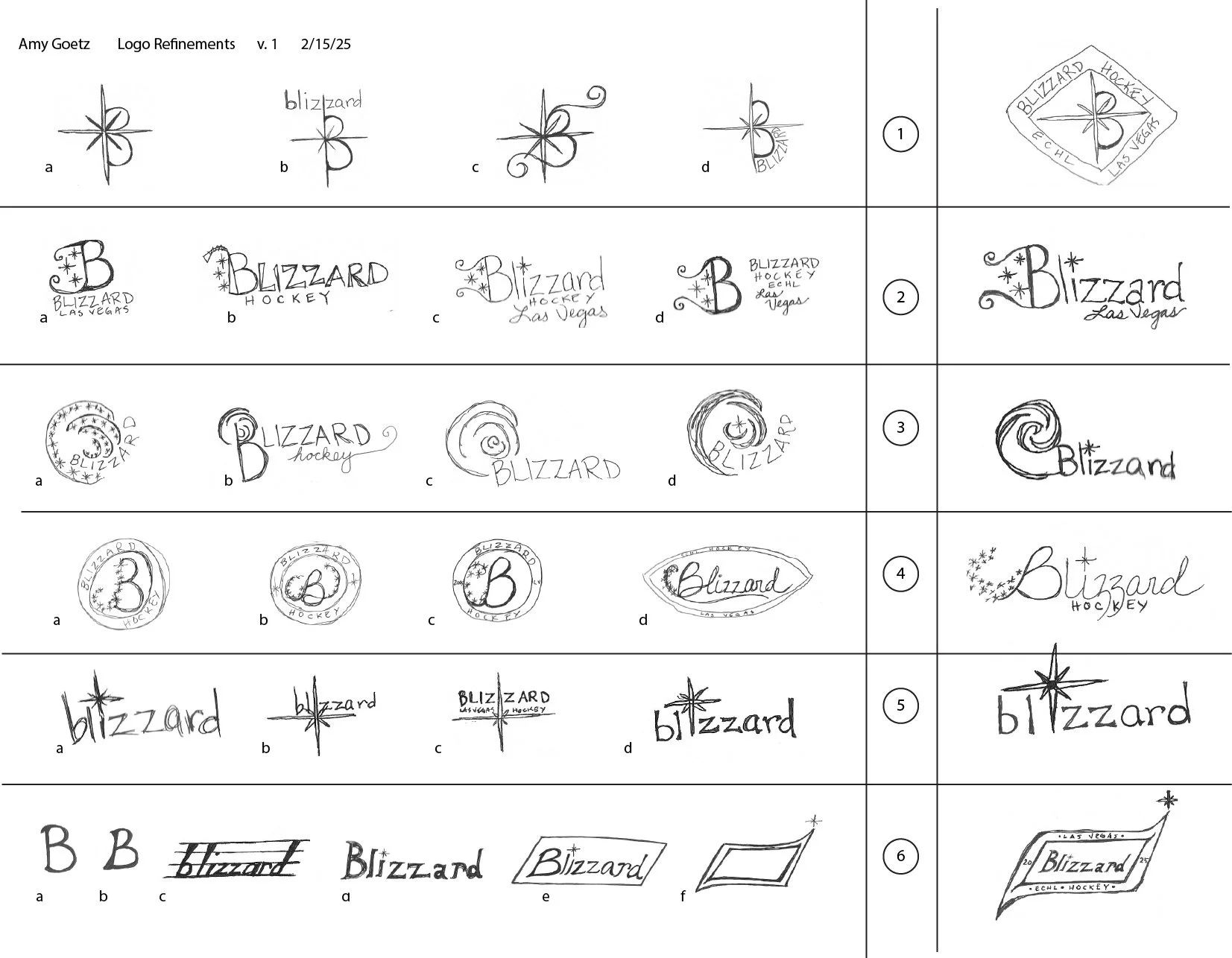 Snowflakes are the logical symbol for a team named the Blizzard. The initial design was comprised of hockey pucks placed on the spokes of a snowflake shape. The initial design didn’t connect to the location of the team, Las Vegas, nor was it an attractive design.