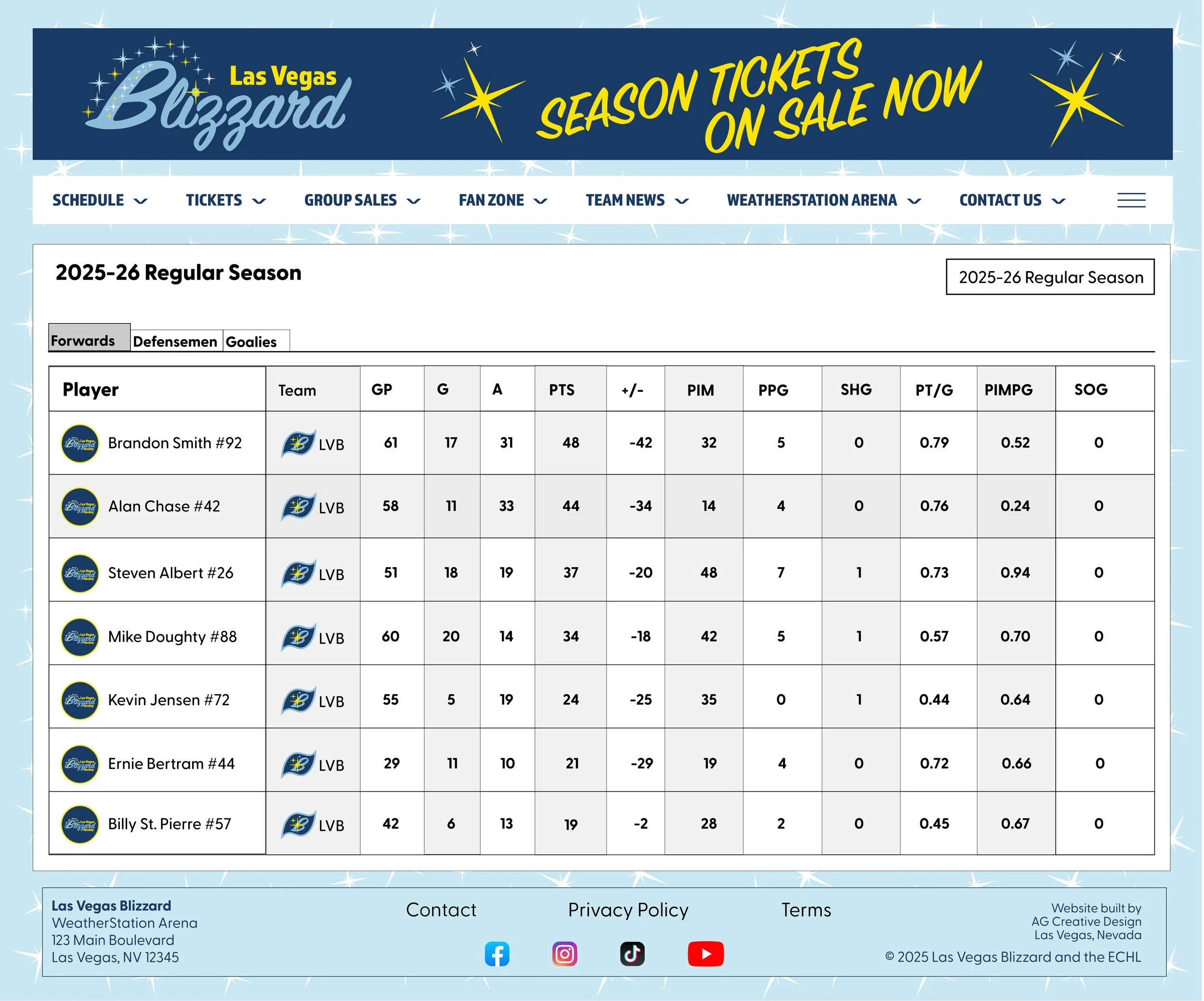 The landing page of the website was redesigned to create a cohesive look across all platforms and paper assets, like the letterhead. The second page is still a listing of the stats and player information that is available from the ECHL database.