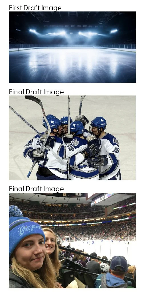 The first vision board created for the Blizzard has a background that is enlarged from a photo of a hockey player spraying ice. The image is filled with varying degrees of values and shades, which made the elements difficult to view. The placement of the elements was haphazard and did not lead the eye through the information. The images were not consistently placed or presented. The body text did not have a typographical hierarchy that organized the information.