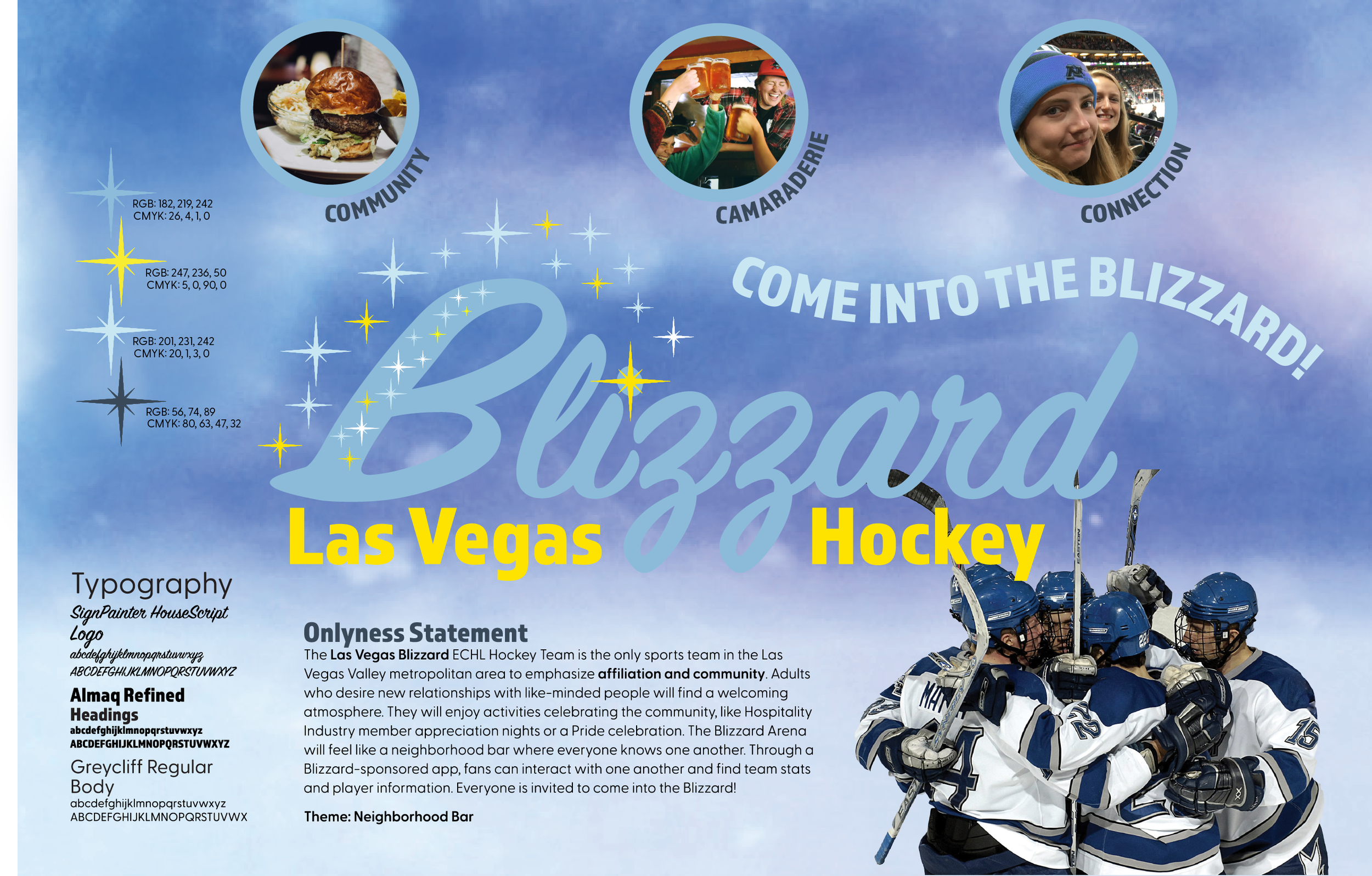 The need for affiliation needed to drive the images in all aspects of the visual designs for the Blizzard. Fans and hockey players must be shown in groups of two or more. Arenas must be shown with fans present. Scenes in the bar & grill must include multiple diners, servers, or bartenders. The people featured should be excited or joyful, in a celebratory mood. Images of food and drinks should also feature multiple items to show that the offerings are plentiful.