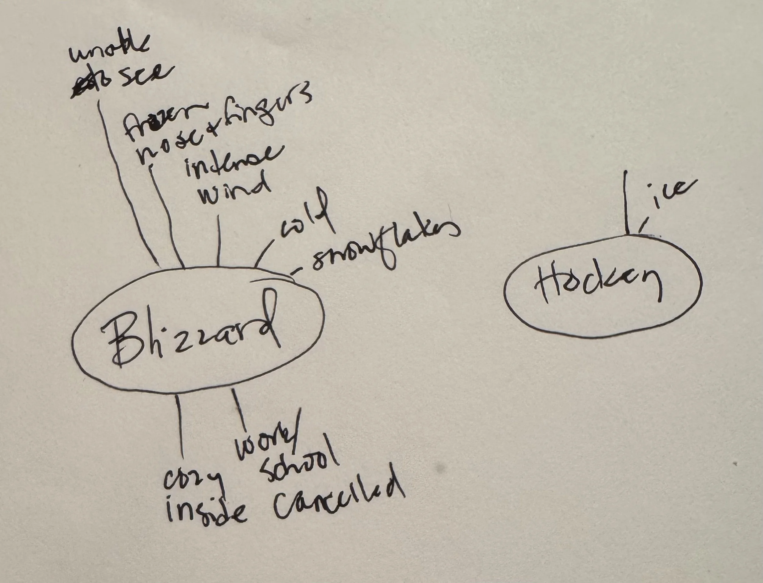 The ideation phase began with a quick word association sketch. “Blizzard” was associated with “frozen nose and fingers,” “intense wind,” and “snowflakes,” but also lead to “cozy inside” and snow days with “work or school cancelled.”