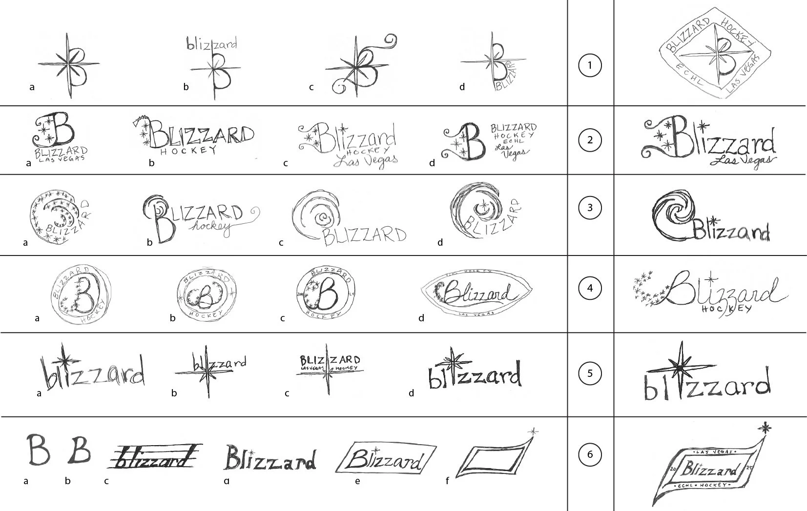 The storm swirl was incorporated into a design that enveloped the word Blizzard or became part of the B in Blizzard. While it was a visually interesting choice, it ultimately didn’t represent affiliation. Another sketch included swirls as filaments on the initial B in the word Blizzard.